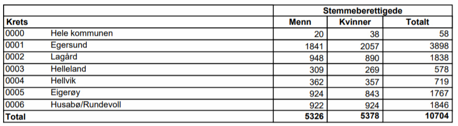 Denne tabellen viser kjønnsfordelingen i manntallet, dvs alle som fyller 18 år i år og som dermed har stemmerett. Den viser bla at det ikke er stor forskjell mellom menn og kvinner i kommunen totalt sett.