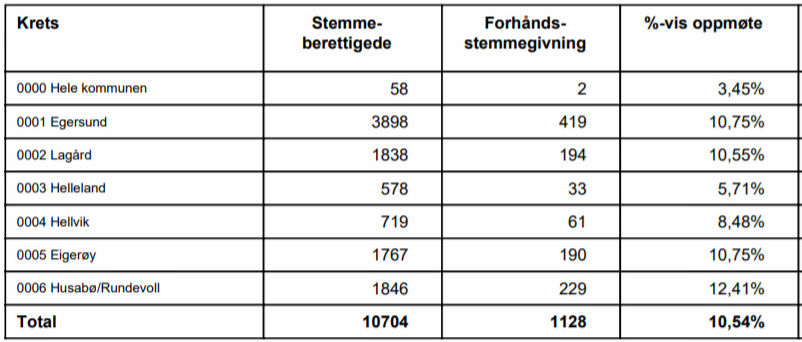 Den skarpskodde leser vil se at det er en differanse på en forhåndsstemme mellom antallet totalt antall mottatte forhåndsstemmer på 1 129 og antallet som er oppgitt i tabellen på 1 128. Dette er fordi det er en stemmegivning som ikke finnes i manntallet, og som vil bli lagt frem for valgstyret med anbefaling om å bli forkastet.