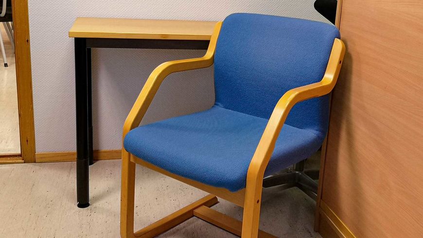 Begge deler fremstår som nye. Bordet har ei bordplate på 50 x 70cm med regulerbare bein. Stolen er blå.
